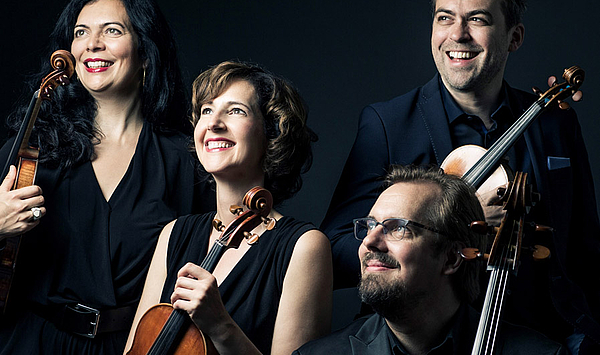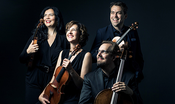 Gemeinsam mit dem Gropius Quartett spielt Honorarprofessorin Alexia Eichhorn (2. von links) ein hochschulinternes Kammerkonzert