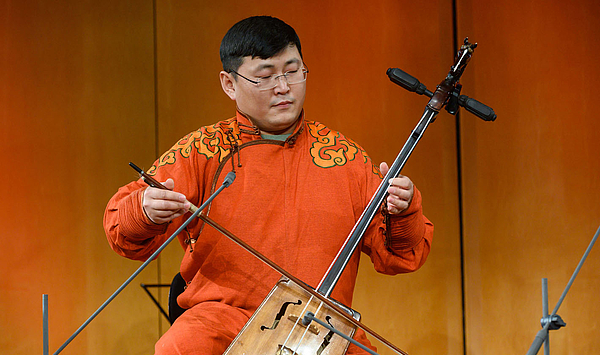 Yesun-Erdene Bat (Mongolei) mit der Pferdekopfgeige „Morin Khuur“ beim Festkonzert zu „10 Jahre Transcultural Music Studies“ im Festsaal Fürstenhaus | Foto: Maik Schuck