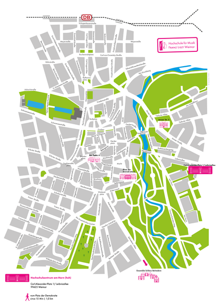 Vom Hauptbahnhof Weimar fahren Sie mit den Buslinien 1, 2, 5, 6 und 8 direkt von der gegenüber liegenden Bushaltestelle bis zum Wielandplatz. Von dort aus gehen Sie über den Frauenplan zum Marktplatz. In unmittelbarer Nähe des Markplatzes befindet sich der Platz der Demokratie mit dem Fürstenhaus, dem Hauptgebäude der Musikhochschule. Die Busfahrpläne zu den einzelnen Linien finden sie hier.