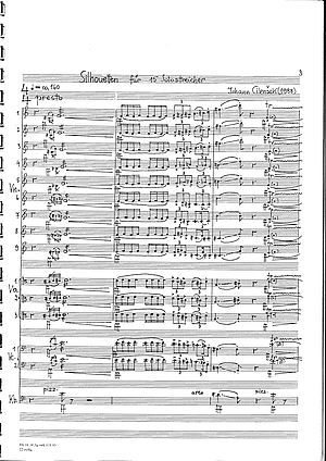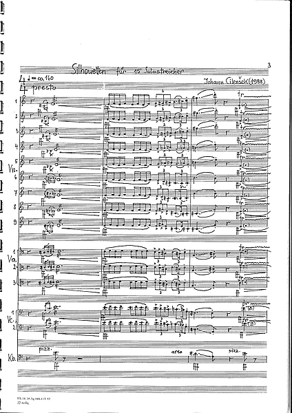 3 Johann Cilenšek, Silhouetten für 15 Solostreicher (1989), Weimar, Teilbibliothek Musikwissenschaft | Hochschularchiv Thüringisches Landesmusikarchiv NJC – 23, S. 2.