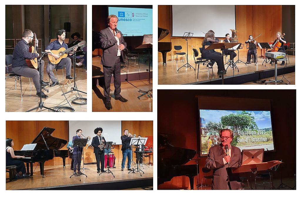 Chair holder Prof. Dr. Tiago de Oliveira Pinto spoke about transcultural influences in music, intangible cultural heritage and the work of the UNESCO Chair. A video with excerpts from the 2023 excursion to Bahia, Brazil, as part of the "Circulating Knowledges" project was also shown. This was followed by two pieces by João Pernambuco, interpreted by the guitarists Silvino Almeida (student in the Transcultural Music Studies profile) and Igor Seiji Moriya (former guitar student at the HfM Weimar). The evening was completed with three Brazilian pieces by the singer Anastasiia Doroshenko (vocal student at the HfM Weimar).