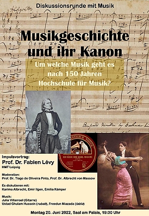 Mindestens genauso anregend war der Impulsvortrag von Prof. Dr. Levy im Saal am Palais. Gemeinsam diskutierten Prof. Levy, Prof. Pinto und Prof. von Massow den musikgeschichtlichen Kanon und 150 Jahre Musikwissenschaft an der Hochschule.