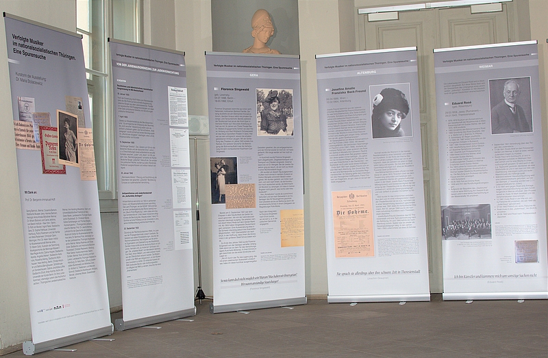 - Die Ausstellung "Verfolgte Musiker im nationalsozialistischen Thüringen. Eine Spurensuche II" präsentiert Schicksale Thüringer Musiker*innen, welche während der nationalsozialistischen Diktatur ausgegrenzt, verfolgt, zum Exil gezwungen oder ermordet wurden. Die Ausstellung unterteilt sich in drei Themenbereiche: jüdische Berufsmusiker*innen, Kultusbeamte jüdischer Gemeinden und ihre musikalischen Aktivitäten sowie Mitglieder der Lagerkapelle des Konzentrationslagers Buchenwald.