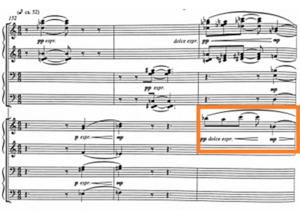 Die erste Episode beginnt mit 6-tönigen Akkorden, die in den ersten drei Takten alle 12 Töne ergeben. Der Höhepunkt liegt nach einem großen Feuerklang wieder mit allen 12 Tönen als Trillerkettenklänge in Terzstrukturen.