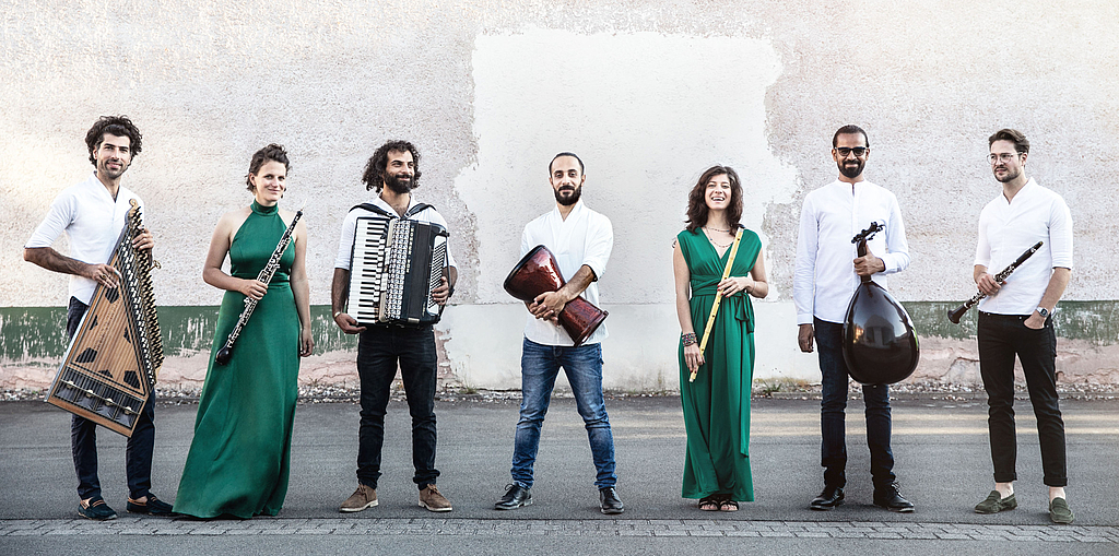 Das Ensemble SYRIAB, 2009 von dem Kanunspieler Ibrahim Bajo gegründet, war ein syrisches Orchester, das unterschiedliche Musikrichtungen arabischer Musik spielte. Wegen des Krieges in Syrien verteilen sich die einst 40 Musiker*innen mittlerweile über die ganze Welt. In Deutschland hat sich SYRIAB in kleinerer Konstellation neu zusammengefunden und entdeckt heute arabische und mediterrane Musik mit seiner innovativen Instrumentierung aus Kanun, Oud, Nay, Percussion, Akkordeon, Klarinette und Oboe. Die Musik ist geprägt von einer eigenen Klangsprache und geht neue Wege, auch durch die Kooperation mit anderen Künstler*innen, Orchestern, Ensembles und Chören. Die Musiker*innen geben außerdem Workshops. Dabei ist es ihnen ein Anliegen, auf die Vielfalt der Musik aufmerksam zu machen und transkulturelles Musizieren zu fördern.
