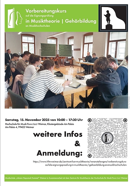 Der Masterstudiengang Musiktheorie in Weimar zeichnet sich durch große Praxisnähe aus. Auf eine mögliche Lehrtätigkeit werden die Studierenden in Tutorien und Kursen in Verbindung mit der Musikschule "Johann Nepomuk Hummel" Weimar vorbereitet.